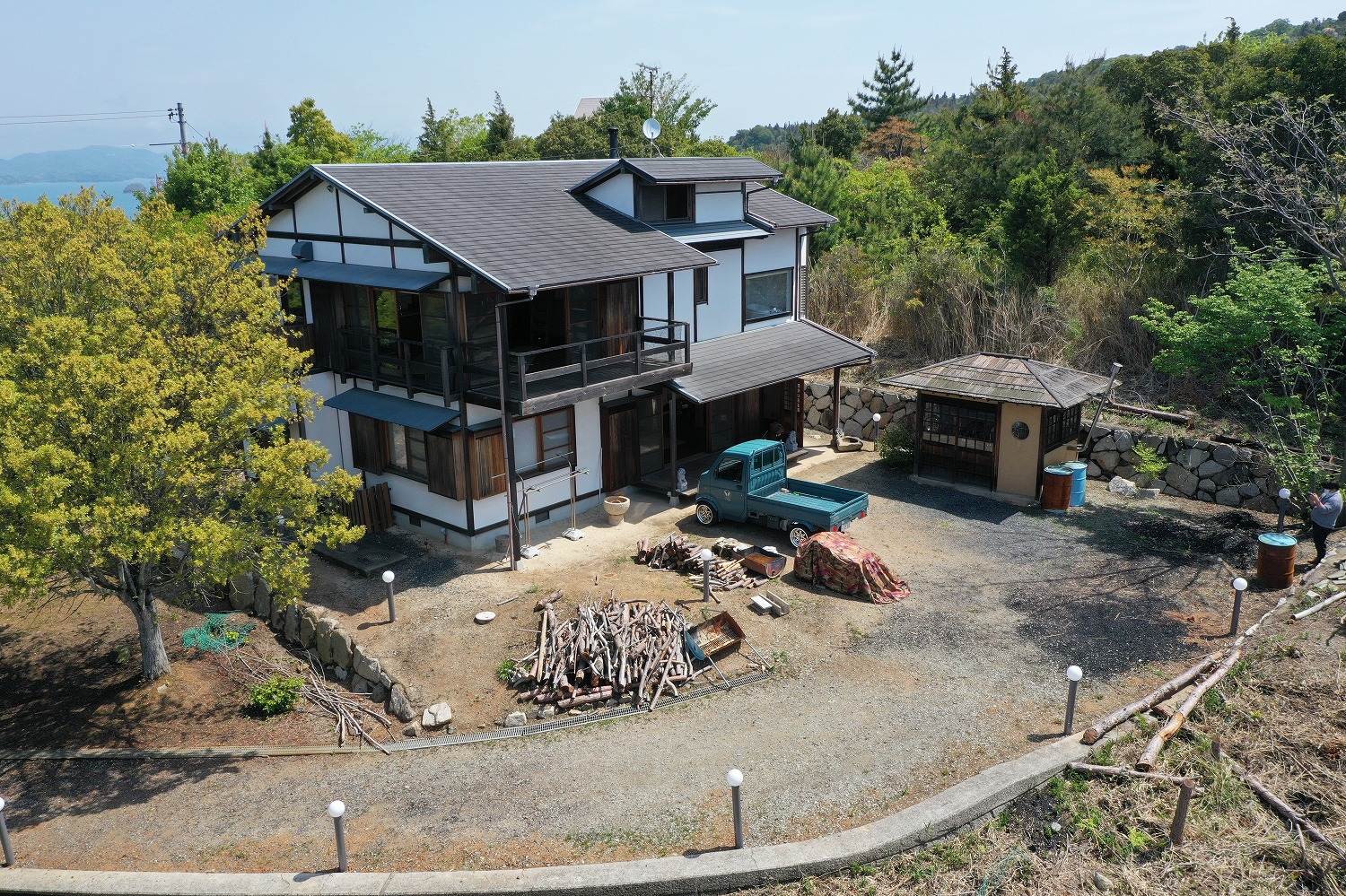 沢山の雑誌で研究し、建てられた「古民家好き」の元オーナーの物件。ダイナミックな吹き抜けに伝統工法ならではのがっちりとした木組みを見せた豪快なつくり。無垢材を贅沢に使用し壁は小舞下地の土壁とし、外壁は白い漆喰。内装はあえて中塗り仕上げで素朴な風合いに。他にも囲炉裏、玄関土間、濡れ縁、木製の雨戸など古き良き時代の日本の伝統が感じられる邸宅となっている。またのんびりとした島の環境は景色も美しく移住にもお勧めできる環境だ。